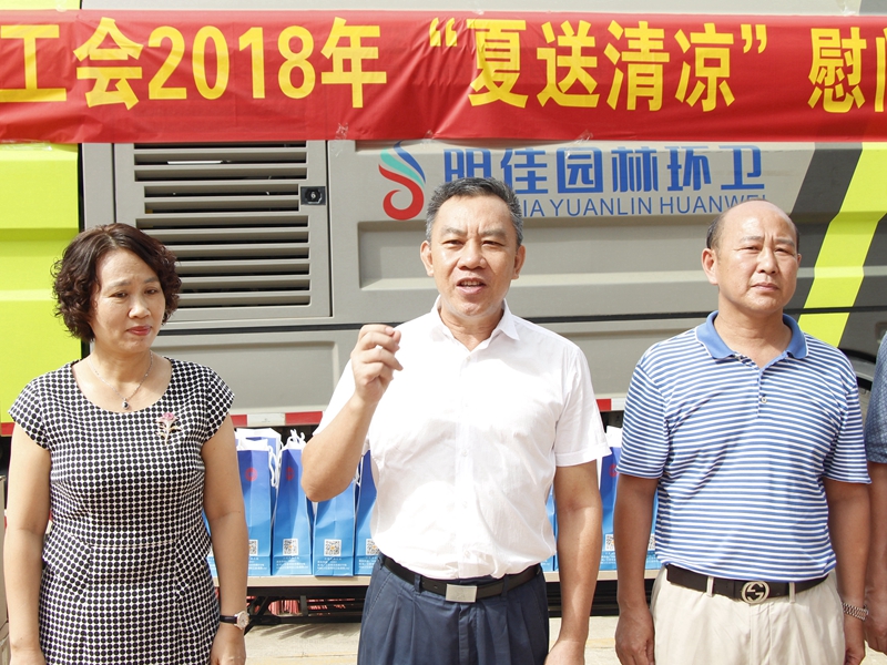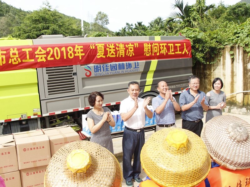 “你們辛苦了!感謝你們?yōu)槿齺喪忻、游客?chuàng)造了一個(gè)干凈整潔的人居環(huán)境,為三亞市“創(chuàng)文鞏衛(wèi)”工作作出的突出貢獻(xiàn)。”。張羽飛代表三亞市總工會(huì)向集團(tuán)公司全體職工致以親切的慰問。他指出,環(huán)衛(wèi)工人頭頂列日,揮灑汗水,以“寧愿一人臟,換來萬家凈”的精神,為靚扮鹿城、建設(shè)國(guó)際化熱帶濱海旅游精品城市提供衛(wèi)生保障。他勉勵(lì)大家繼續(xù)發(fā)揚(yáng)三亞環(huán)衛(wèi)人的精神,勇當(dāng)尖兵的決心,提高環(huán)衛(wèi)作業(yè)質(zhì)量,在三亞市社會(huì)文明大行動(dòng)和新一輪“創(chuàng)文鞏衛(wèi)”工作中作出新的更大貢獻(xiàn)。