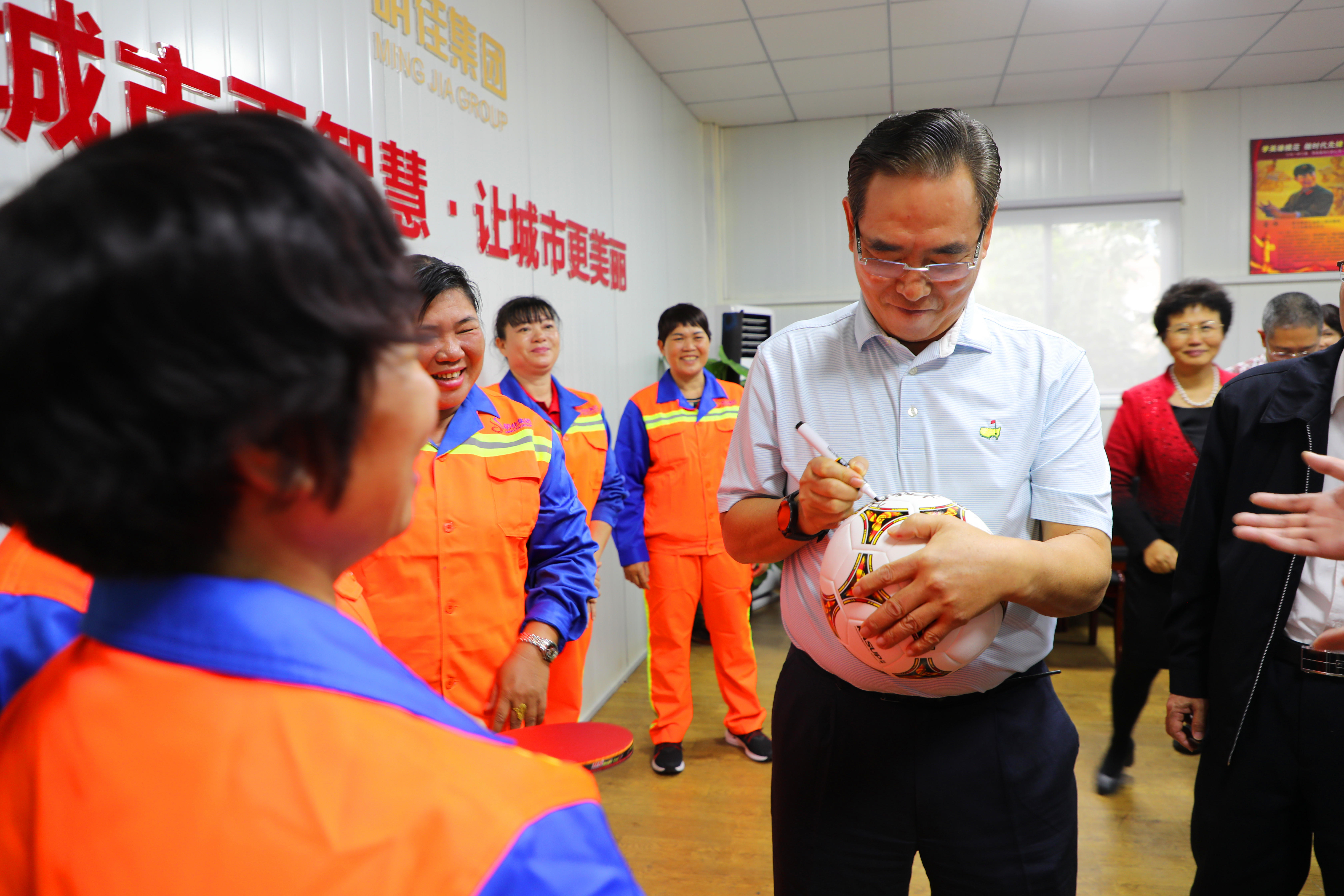 座談會(huì)結(jié)束后,明佳集團(tuán)一些職工表示非常喜愛(ài)乒乓球及足球運(yùn)動(dòng),一直都是蔡副主席的粉絲,希望獲得蔡振華副主席的親筆簽名。蔡副主席非常親切地為他們簽名,并與之合影留念。