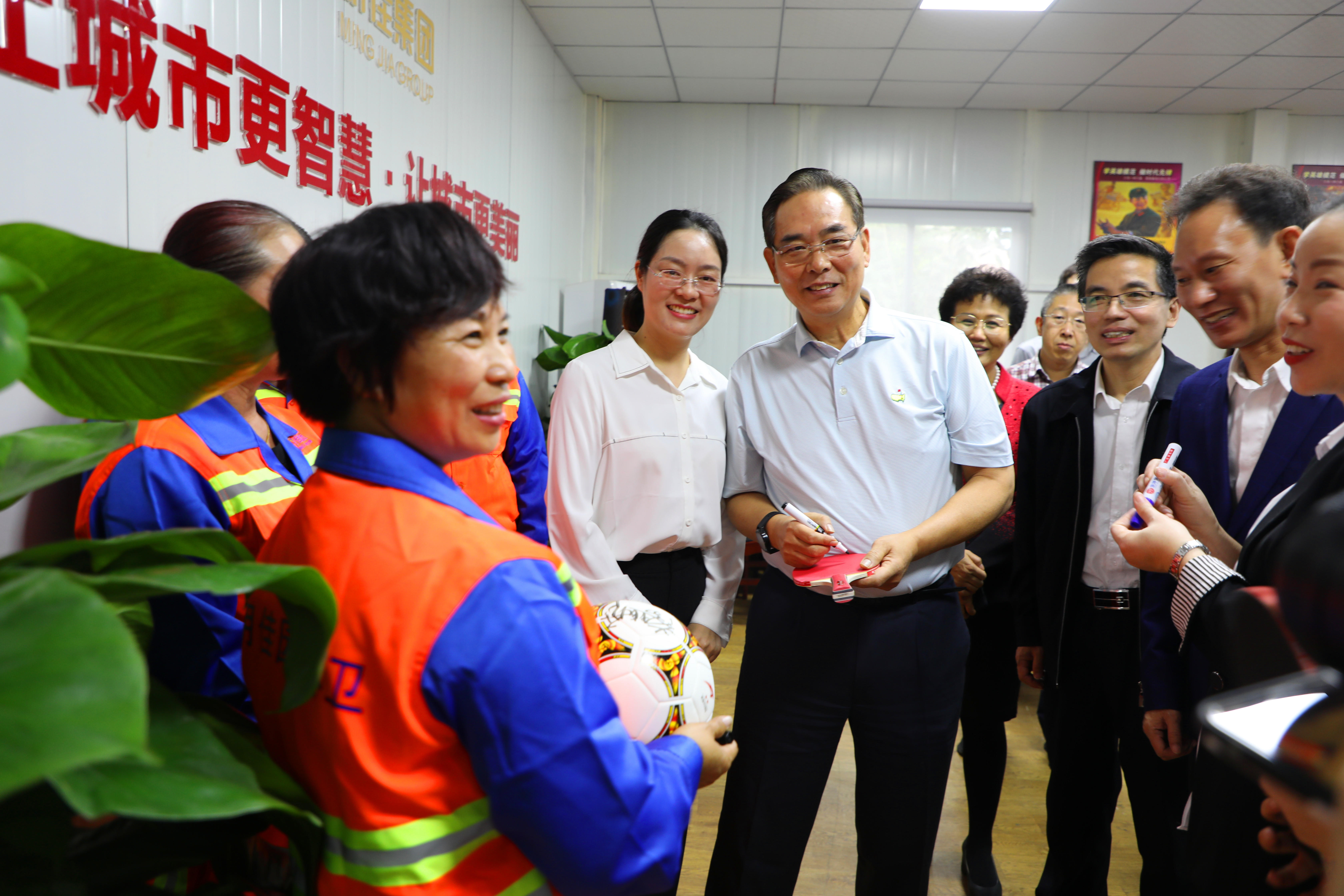 座談會(huì)結(jié)束后,明佳集團(tuán)一些職工表示非常喜愛乒乓球及足球運(yùn)動(dòng),一直都是蔡副主席的粉絲,希望獲得蔡振華副主席的親筆簽名。蔡副主席非常親切地為他們簽名,并與之合影留念。