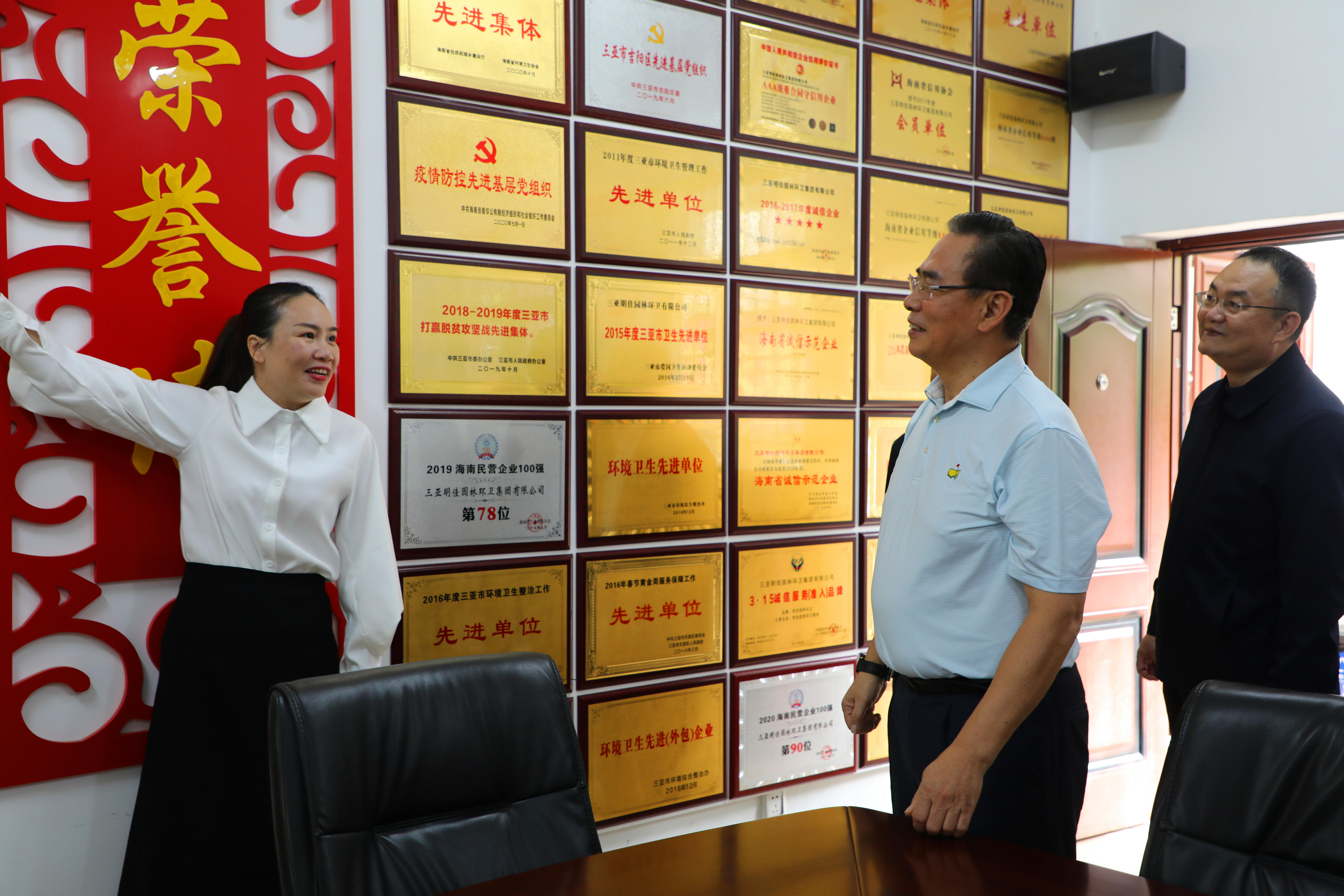 蔡副主席一行來到明佳集團(tuán)職工之家,工會(huì)主席高斐斐介紹職工書屋由三亞市總撥?、集團(tuán)黨支部共同出資建立,現(xiàn)藏書一千余冊(cè),并配備投影儀、電腦、電子閱覽器等設(shè)備,蔡副主席對(duì)職工書屋的建設(shè)表示了充分的肯定。來到企業(yè)榮譽(yù)墻面前,高斐斐介紹了近期工會(huì)工作取得的海南省工人先鋒號(hào)等榮譽(yù),蔡副主席對(duì)工會(huì)取得的成績(jī)表示了極大的贊賞。