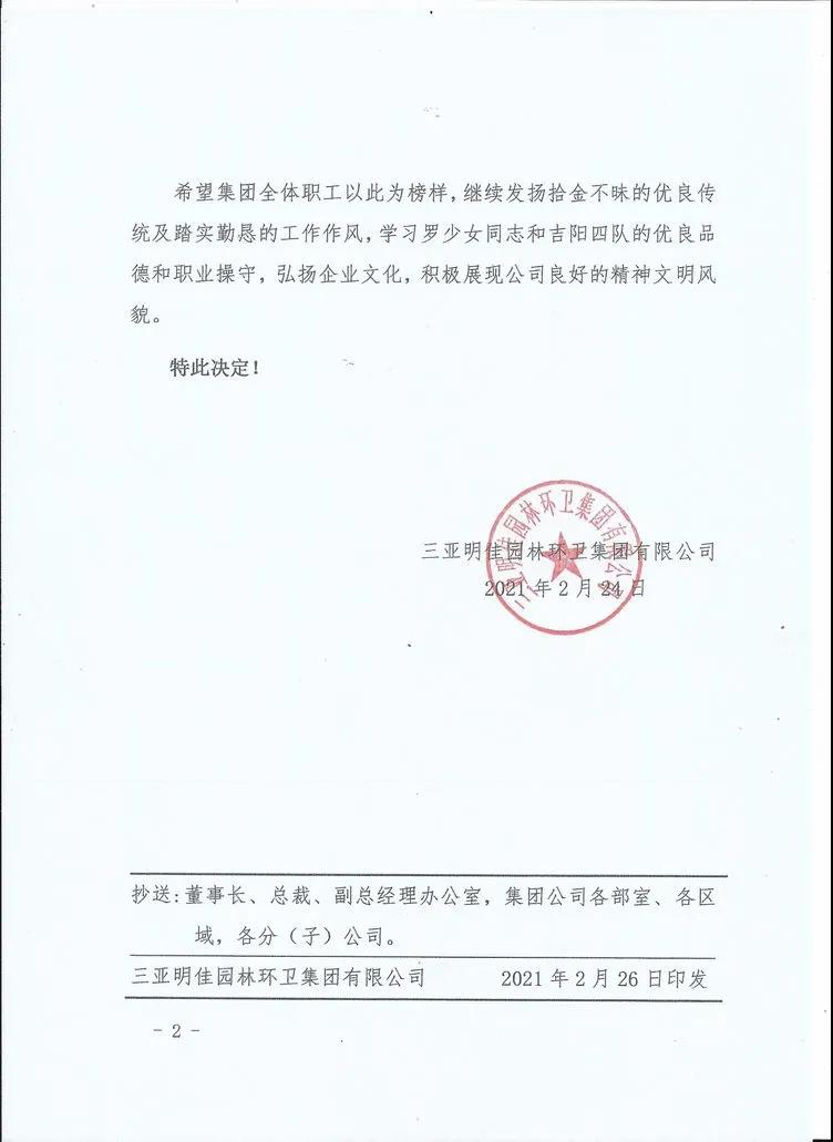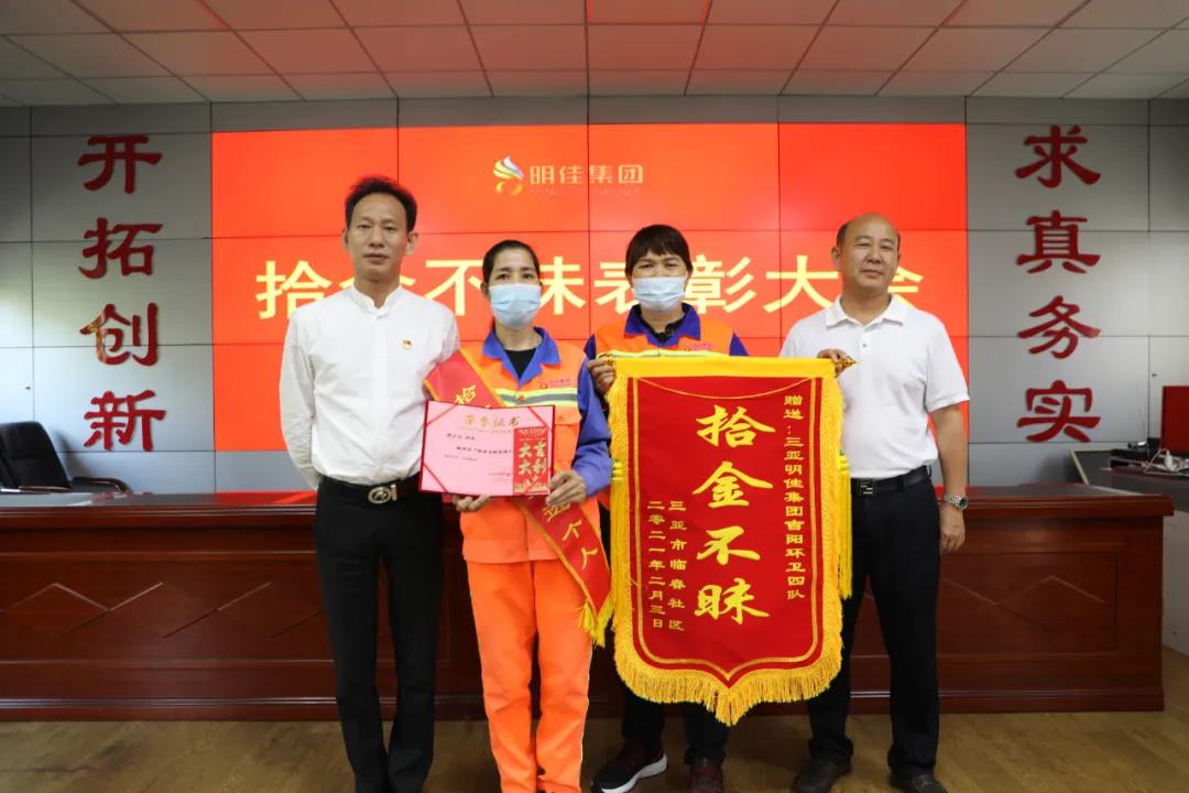 為表彰羅少女同志拾金不昧的精神,三亞明佳園林環(huán)衛(wèi)集團(tuán)有限公司于2021年2月25日 15:30時,在集團(tuán)公司三樓會議室召開拾金不昧表彰大會。明佳集團(tuán)黨支部書記、董事長陳明,黨支部副書記、總裁陳云及20名員工代表參加會議。