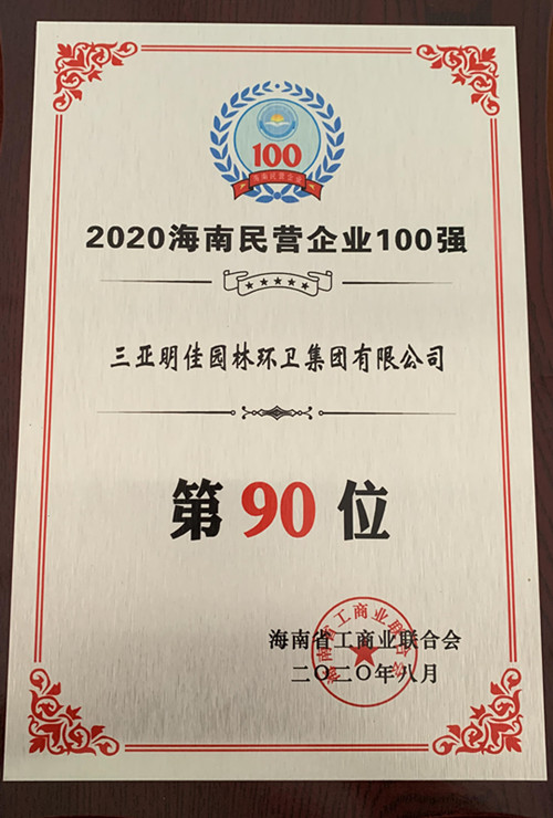 8月28日,“2020海南民營企業(yè)百強(qiáng)發(fā)布會”在?谂e行。三亞明佳園林環(huán)衛(wèi)集團(tuán)有限公司再次入選“海南民營企業(yè)100強(qiáng)”榜單,名列第90位。